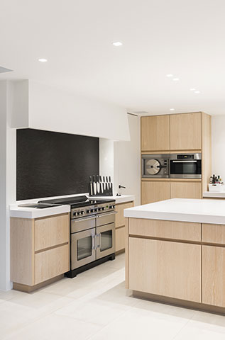 In de keuken zorgt de warmte van het hout voor de gezellige sfeer terwijl de smeedijzeren deuren en het composieten tablet het geheel een modernere toets geven. Ook in de woonkamer, slaapkamers, badkamers en het bureau werden verschillende kleuren en materialen gebruikt.